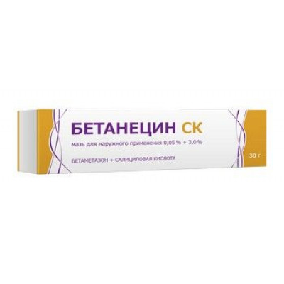 БЕТАНЕЦИН СК – комбинированный препарат, содержащий действующие вещества бетаметазона дипропионат и салициловую кислоту. Бетаметазона дипропионат – синтетический фторированный глюкокортикостероид (ГКС) – оказывает противовоспалительное, противозудное и сосудосуживающее действие. Салициловая кислота, обладая кератолитическим действием, способствует проникновению бетаметазона в кожу. Обладает бактериостатическим и некоторым фунгицидным действием. Сочетанное действие активных компонентов приводит к быстрому снижению выраженности таких симптомов как зуд, раздражение, эритема и боль.