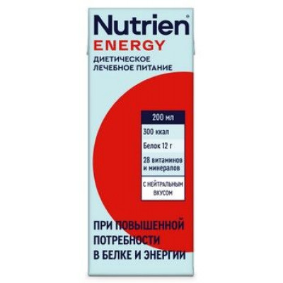 для энтерального питания (зондового или перорального использования) взрослых и детей старше 3 лет (ПРИЛОЖЕНИЕ) с высокими потребностями в белке и энергии при различных заболеваниях, включая критические состояния, термические поражения, онкологические заболевания, муковисцидоз, паллиативные состояния, в качестве основного или дополнительного питания, когда обычный прием пищи невозможен, ограничен или недостаточен. Приготовление: Перед употреблением упаковку с Nurtien Energy нужно встряхнуть. При введении в зонд продукт должен быть или комнатной температуры, или подогрет Нельзя подогревать продукт в микроволновой печи. Закрытую упаковку хранят при температуре от 2 до 25 С и в сухом помещении (относительная влажность воздуха – менее 75 %). Открытая упаковка продукта может храниться при комнатной температуре в течение 6 часов, в холодильнике – не более 24 часов. Продукт нельзя замораживать. Рекомендованная доза для взрослых: 2-3 упаковки Nutrien Energy 200 мл в день – в качестве дополнения к обычному рациону. 5-7 упаковок Nutrien Energy 200 мл в день – в качестве единственного источника питания. Если не назначено врачом иначе.