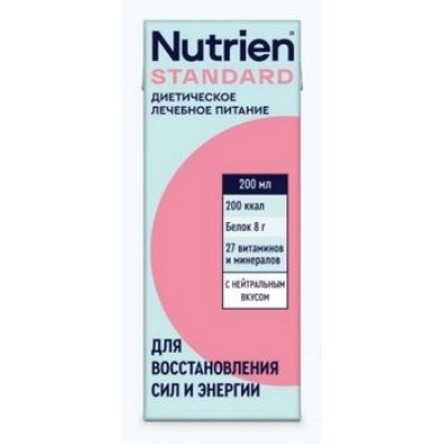 для энтерального питания (зондового и перорального использования) взрослых и детей старше 1 года при различных заболеваниях, включая критические состояния, термические поражения, онкологические заболевания, заболевания органов желудочно-кишечного тракта, муковисцидоз, паллиативные состояния, в качестве основного или дополнительного питания, когда обычный прием пищи невозможен, ограничен или недостаточен. Приготовление: Перед употреблением упаковку с Nutrien Standard нужно встряхнуть. При введении в зонд продукт должен быть или комнатной температуры, или подогрет до 30-36 С. Нельзя подогревать продукт в микроволновой печи. Рекомендованная доза для взрослых: 2-3 упаковки Nutrien Standard 200 мл в день – в качестве дополнения к обычному рациону. 5-7 упаковок Nutrien Standard 200 мл в день – в качестве единственного источника питания. Если не назначено врачом иначе.